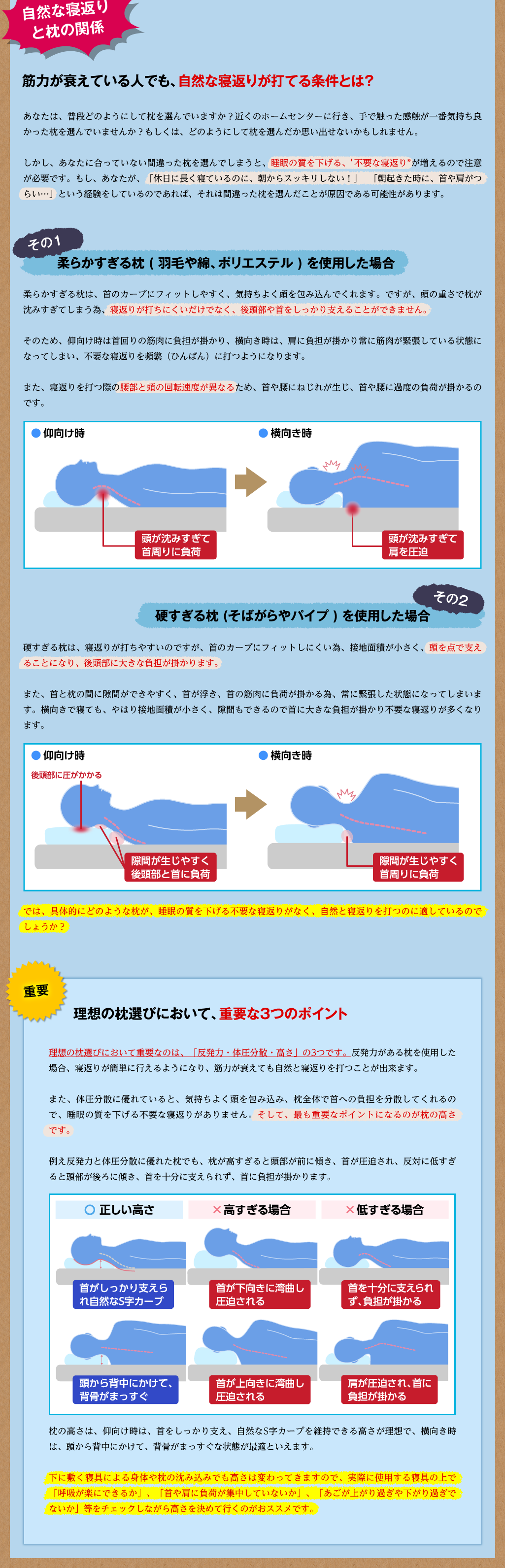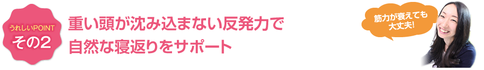反発弾性が高いので頭が沈み込まず余計な力を使わず自然な寝返りをサポートします。寝返りがスムーズなので朝まで快適です。