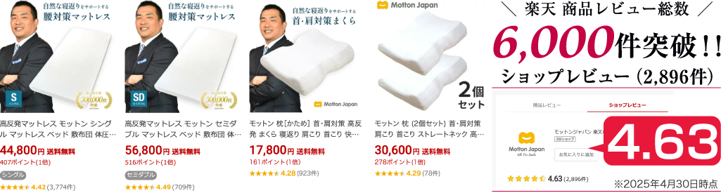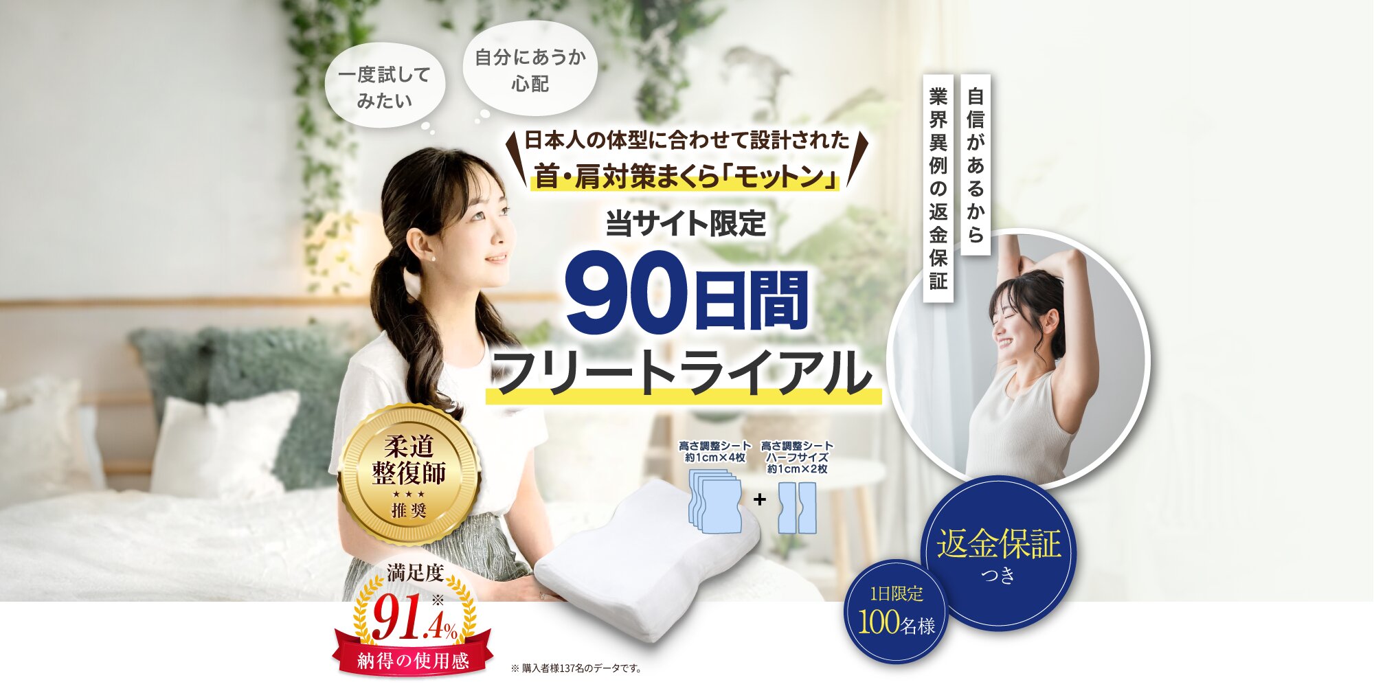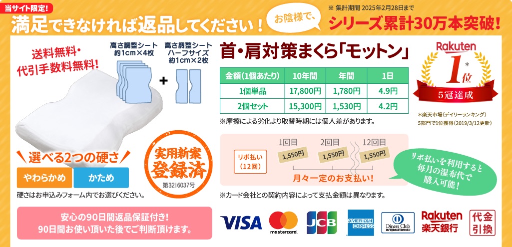 通常、寝具業界的では枕は5年と言われておりますが、モットン枕は、優れた耐久性で、理想的な寝姿勢を維持し続けます。