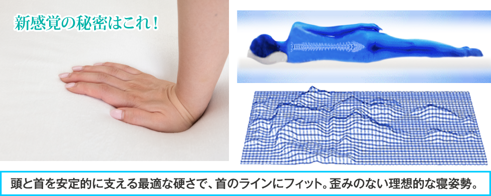 首・肩への負担を軽減する要となるウレタンフォームは、 反発弾性(%)×体圧分散 ×密度(D)×硬さ(N)の4つが密接に関係 しており、そのバランスが大変重要です。