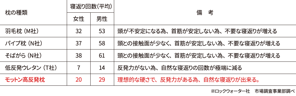 羽毛やパイプ、そば殻を使用した場合、不要な寝返りが増え、モットン高反発枕が一番自然な寝返りの数値となるという結果になりました。