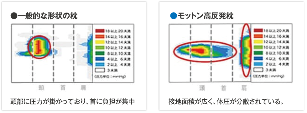 実際に、一般的な形状の枕を使った場合と、モットン高反発枕を使用した場合にかかる体圧を計測してみました。
