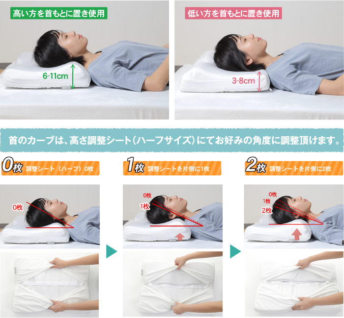 はじめは枕が高いかなと思いましたが、高さ調整シートで調整すると、数日で慣れてきて、今では朝まで気持ちよく眠れるようになりました。