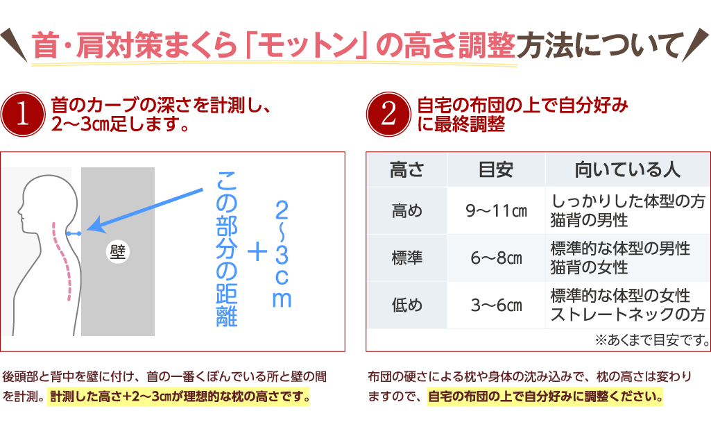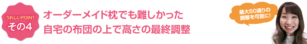 オーダーメイド級の高さ調整を、自宅の布団の上で枕や身体の沈み込み、その日の気分や体型の変化に合わせて最終調整頂けます。