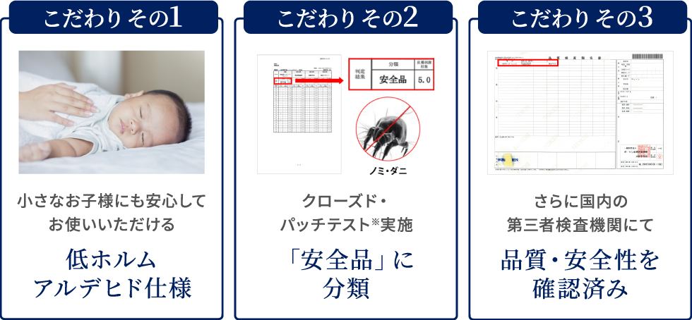 ホルムアルデヒド含有量は、出生後24カ月以内の乳幼児が使用するものは、16μg/g以下という販売基準がございます。