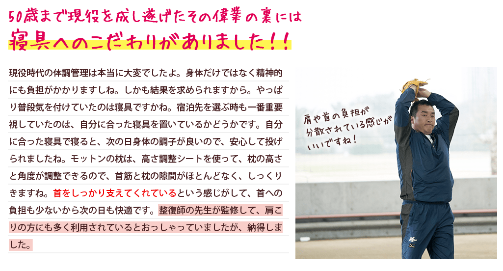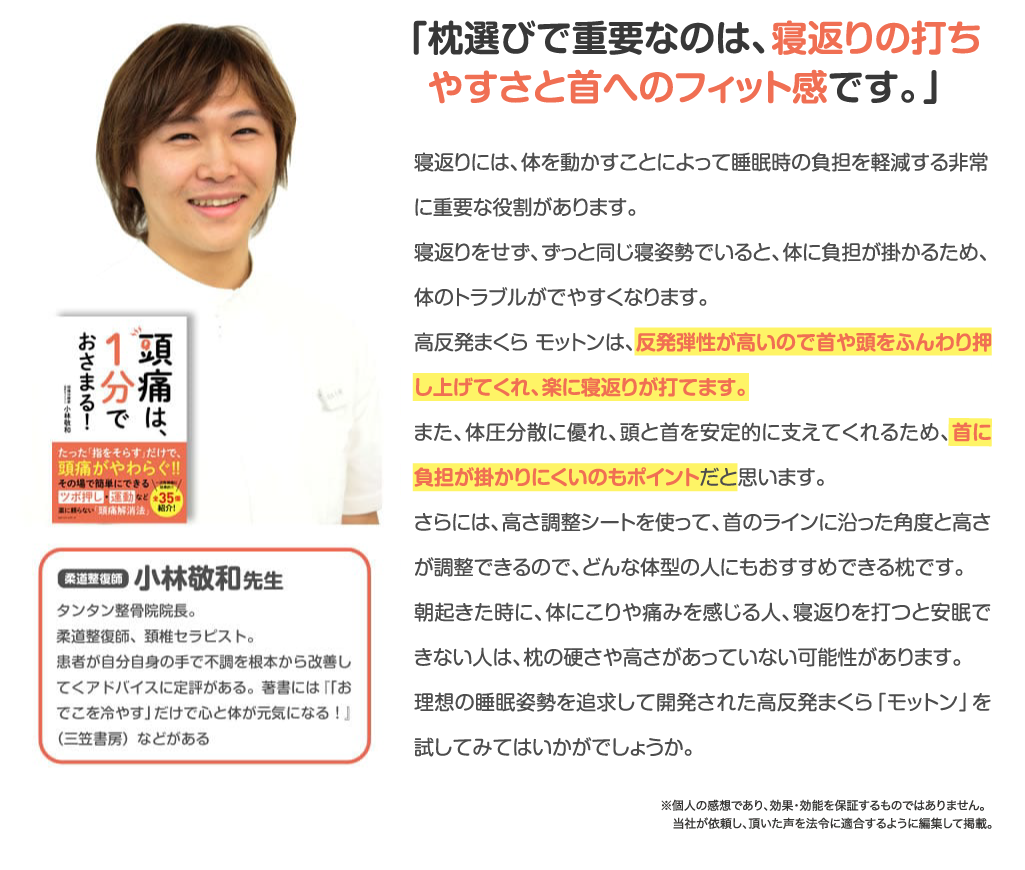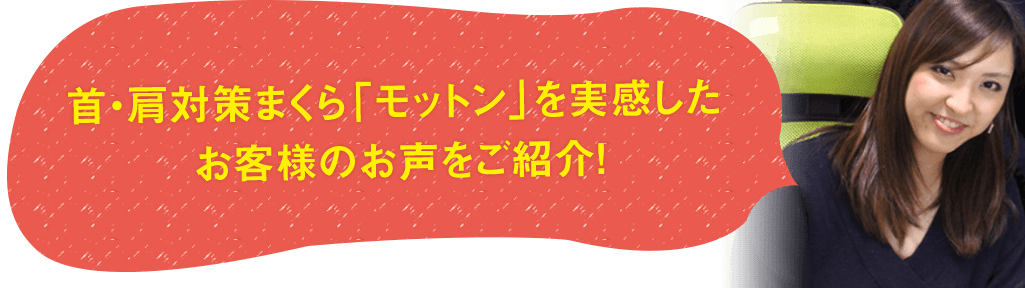 それがモットン枕を使いはじめてからは、首の違和感がほとんどなくなり、夜はスヤスヤと朝まで心地良く眠れるようになりました。