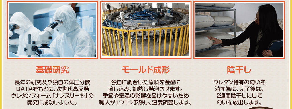 モットンジャパンでは、様々な体重、年齢、性別。あらゆるデータを収集分析し、国内および海外の著名な医学博士及び専門家との連携を基盤に、次世代ウレタンフォーム「ナノスリー®」の開発に成功しました。