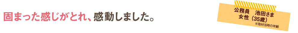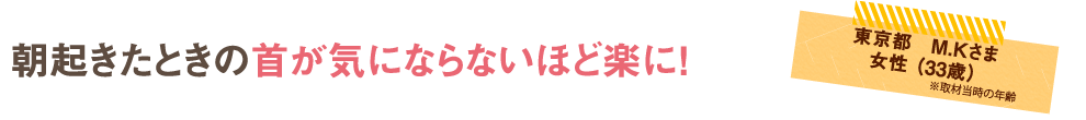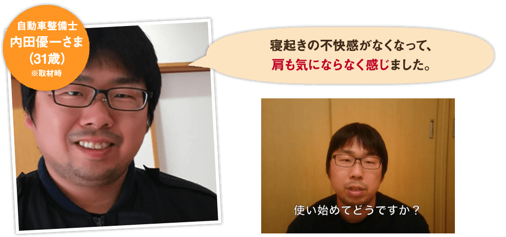 今までは、寝起きとかに不快感を感じていたんですけど枕を変えてからは頭の痛みもなくなって肩も気にならなくなりました。寝起きが違います。今でも整体に行くんですけど、先生にハリもなくなったねって言われて、自分でもすごく軽く感じるようになりました。