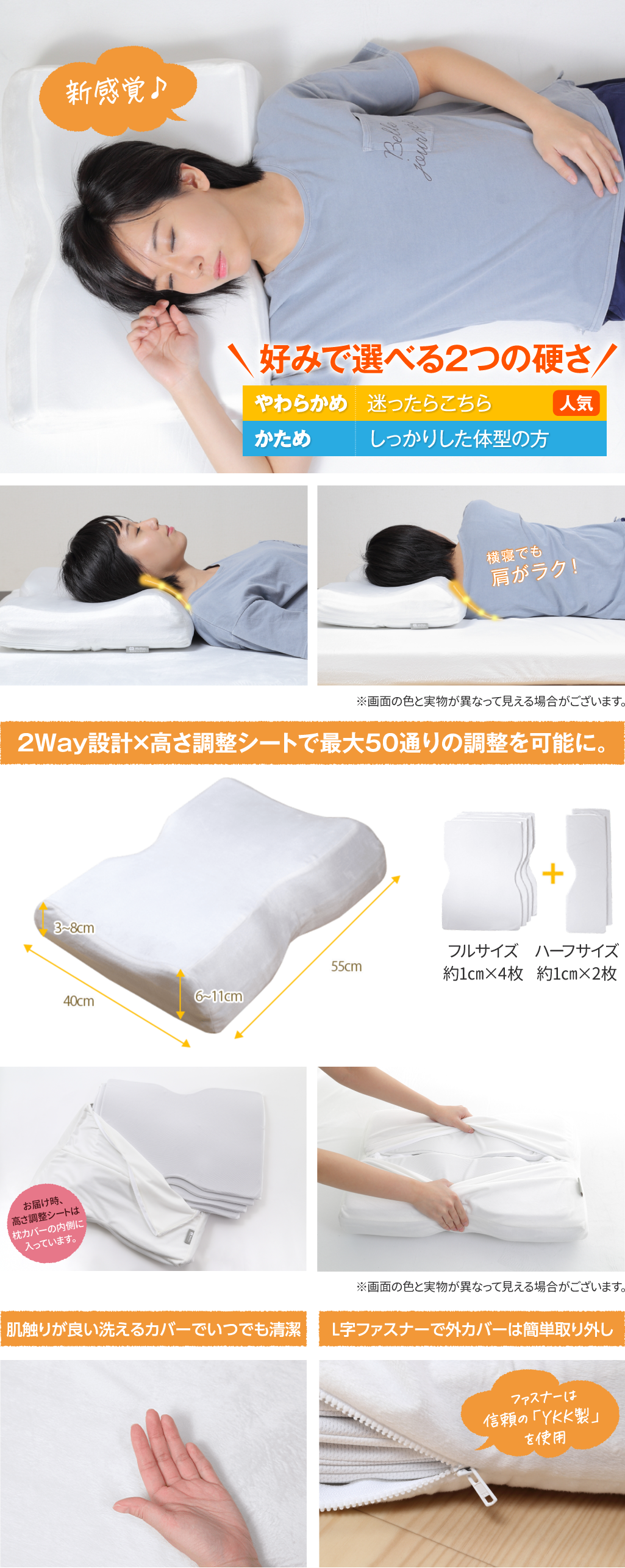 今まで低反発の枕いろいろ試してみたみたんですけど全然駄目で、高反発だとしっかり固定して支えてくれるので、それが買う決め手になりました。今までは低反発枕を使っていた時は、裏にタオルを入れたりして高さを調節してたんですけど、この枕は高さ調整シートがあってそれがすごい便利です。快適に眠れるのが1番いいですね。