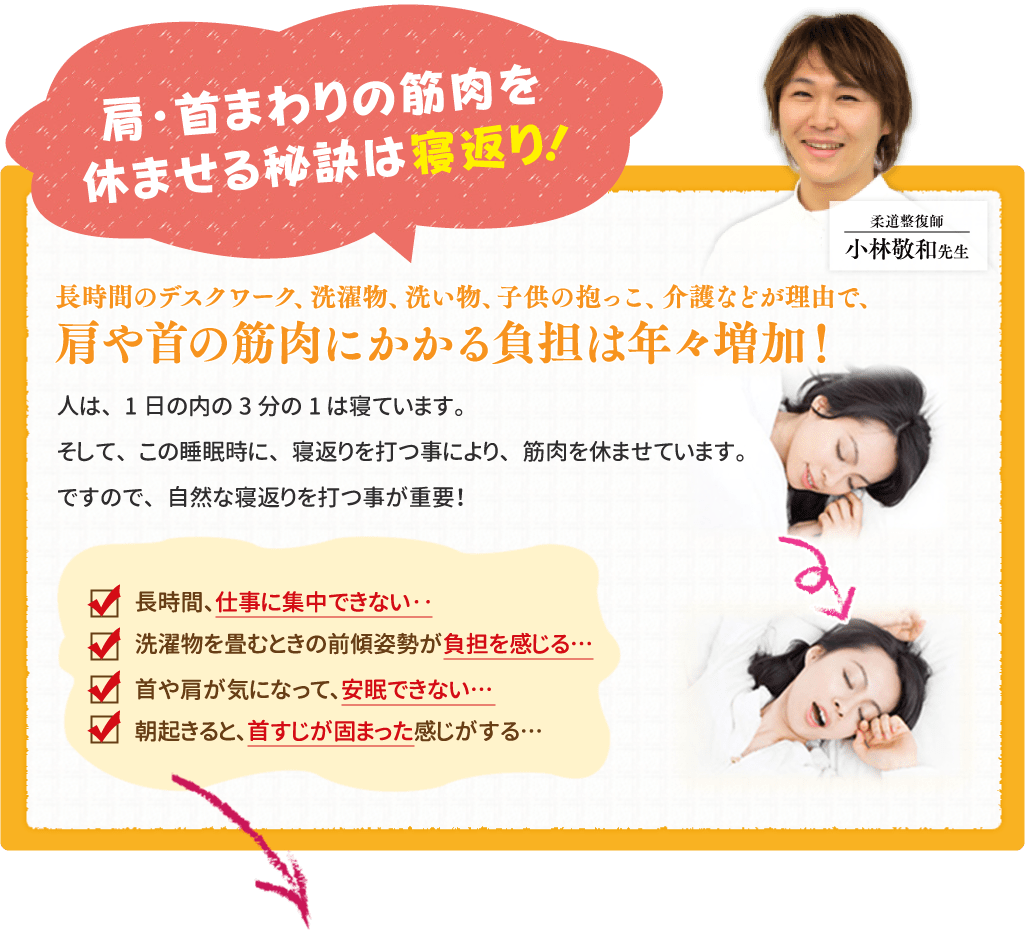肩が気になるって感じで、毎日安眠できない感じでした。職業柄、力仕事をしなくちゃいけないので、肩をかばっていました。